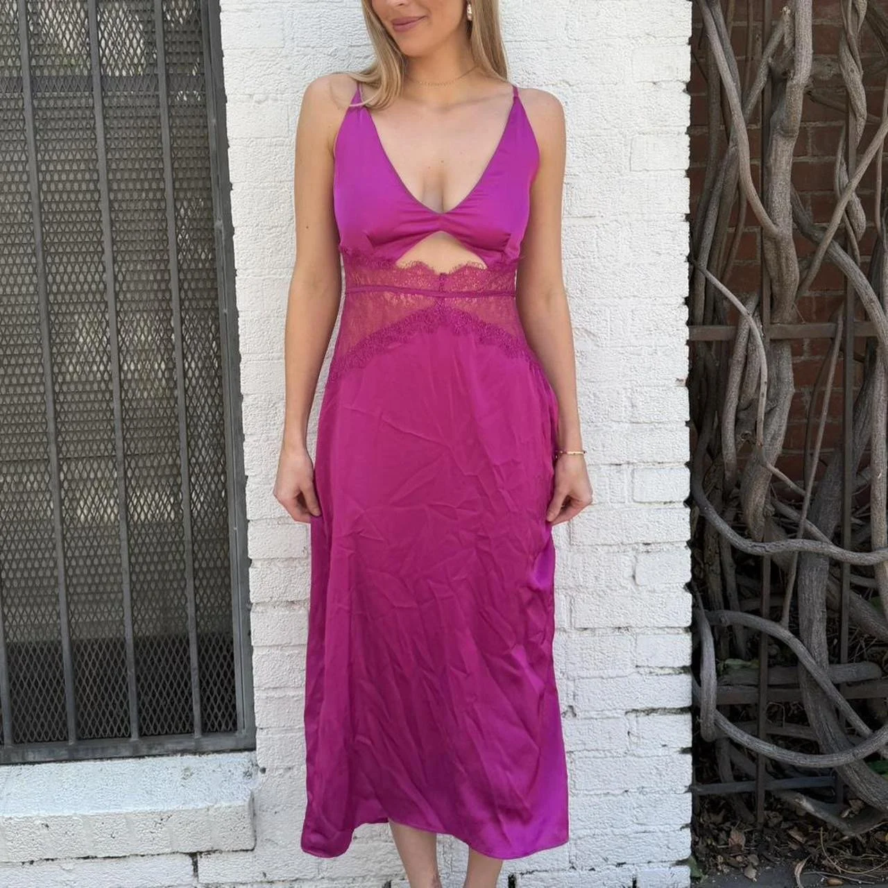 Image 1 of 5 Image 2 of 5 Image 3 of 5 Image 4 of 5 Image 5 of 5 Pink maxi dress with lace trim and cutout detail Sz L $50.00 Pink maxi dress with lace trim and cutout detail Sz L #fairycore #party Add To Cart Added! Pink maxi dress with lace trim and cutout detail Sz L #fairycore #party