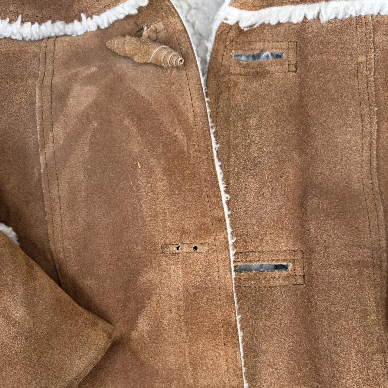 Vintage Pioneer Wear Men's suede leather coat size 38 (medium) brown leather sherpa lined mountain man USA / missing middle button + suede could use a good cleaning