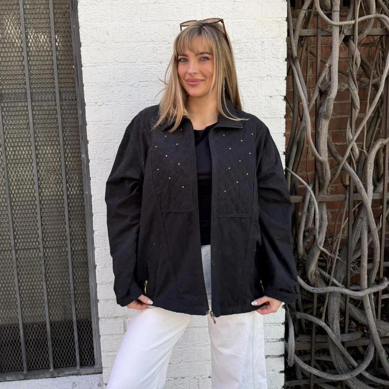 Image 1 of 5 Image 2 of 5 Image 3 of 5 Image 4 of 5 Image 5 of 5 Vintage Black quilted outbrook lightweight bomber jacket with gold studs sz L $45.00 Vintage Black quilted outbrook lightweight bomber jacket with gold studs sz L #biker #goth Add To Cart Added! Vintage Black quilted outbrook lightweight bomber jacket with gold studs sz L #biker #goth